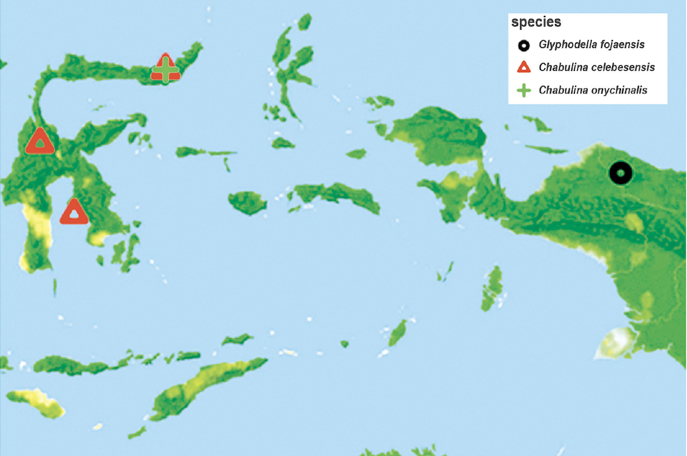 Based on research findings, Glyphodella fojaensis lives in the primary tropical forests of the Foja Mountains in Papua, while Chabulina celebesensis is found in secondary tropical forests in Sulawesi. Both species are nocturnal, or active at night.