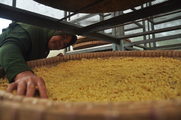 Foto banner: Siti Maryam menjemur tepung dari ubi kuning untuk diproduksi sebagai bahan tambahan tiwul instan di rumahnya, Desa Lipursari Kecamatan Leksono, Kabupaten Wonosobo. (Hartatik)