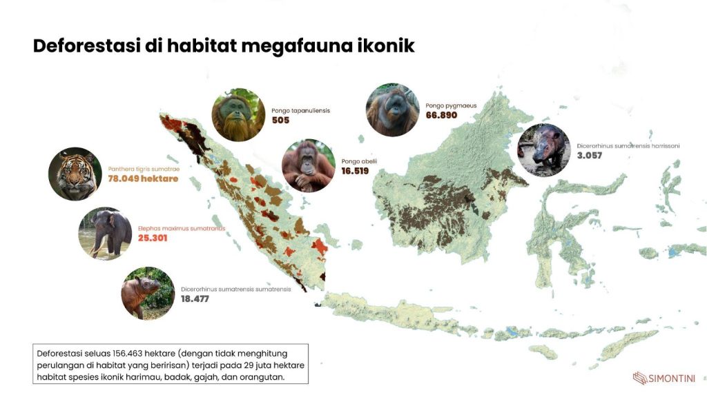 Selain implikasi iklim, laporan tersebut juga memperingatkan adanya dampak serius terhadap keanekaragaman hayati. Deforestasi pada tahun 2025 telah merusak 156.463 hektar habitat spesies yang terancam punah. Harimau Sumatra kehilangan 78.049 hektar habitatnya, disusul oleh orangutan Kalimantan dengan 66.890 hektar. Kerugian yang lebih kecil namun signifikan juga tercatat pada gajah Sumatra, badak Sumatra, dan orangutan Tapanuli yang terancam punah, yang kehilangan 505 hektar dari wilayahnya yang sudah terbatas.