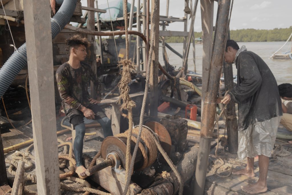 Sekelompok penambang ilegal mencuci bijih timah di atas perahu apung mereka di perairan Teluk Kelabat Dalam. Foto oleh Nopri Ismi.